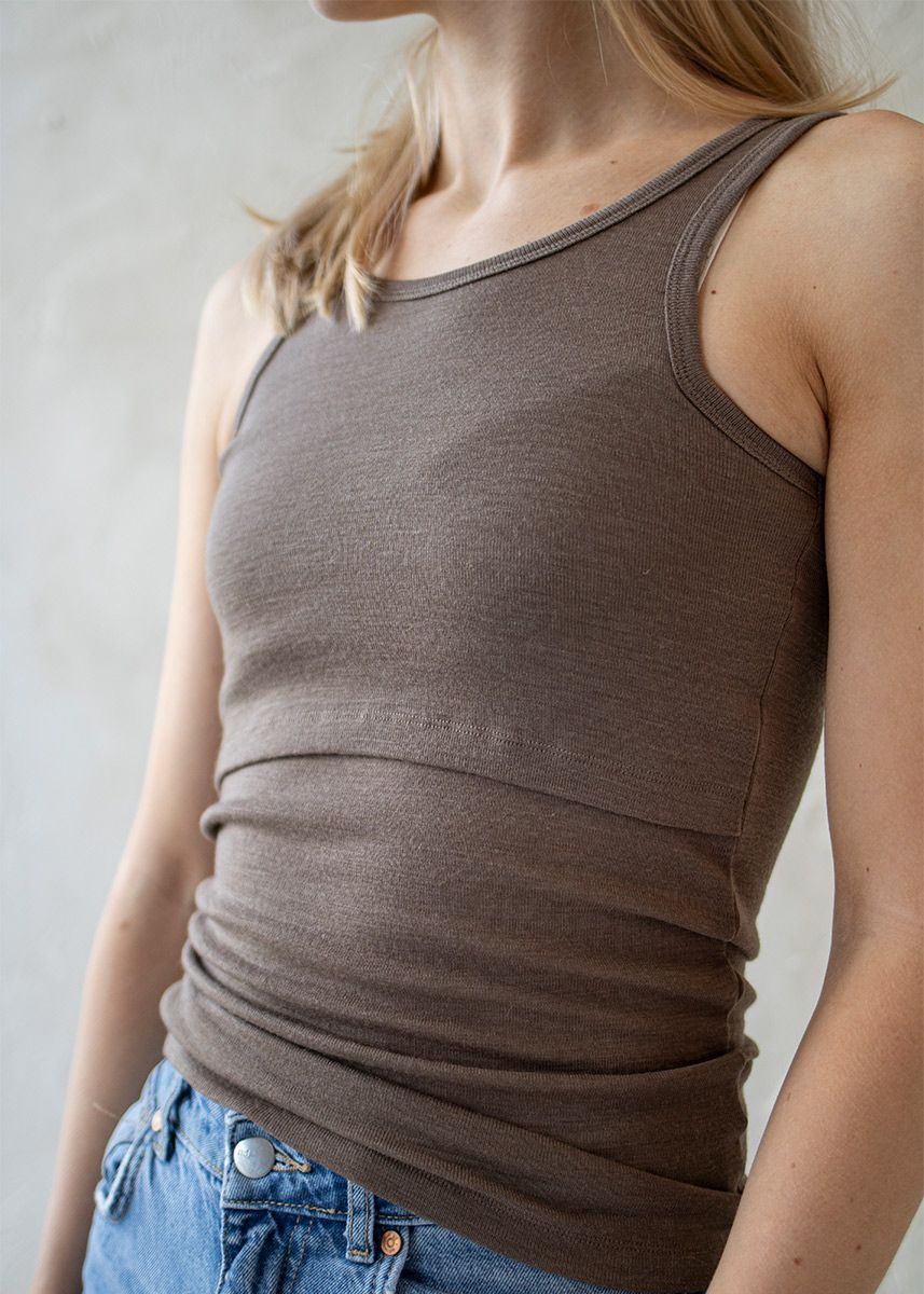 Singlet i myk og lun ull med silke med dobbel overlapp i front for amming. Den har brede og komfortable stropper og er høy i nakken. På innerste lag er det en smal elastikk, som gjør at toppen lett kan dras ned ved behov. Ull isolerer både mot kulde og varme, og hvis den blir fuktig stjeler den ikke varme fra kroppen mens den tørker slik bomull gjør. Isteden transporterer den fuktigheten bort fra huden.