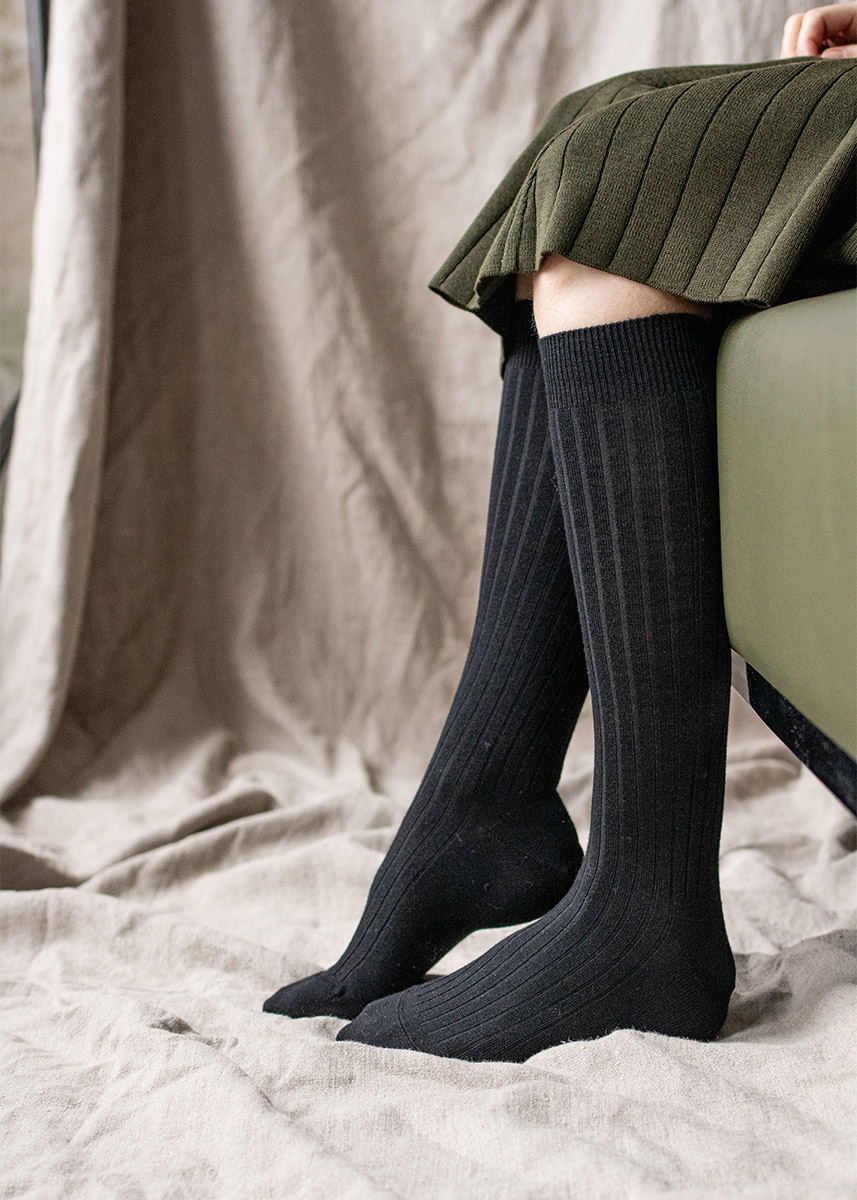 Myke og elastiske knestrømper i ubehandlet merinoull. Fine å bruke hele året og perfekt under buksen eller i støvletter på litt kaldere dager. Sokkene er forsterket med litt bomull, men fordi sokkene er tynne og består av fin merinoull, kan de etterhvert slites på utsatte punkter.