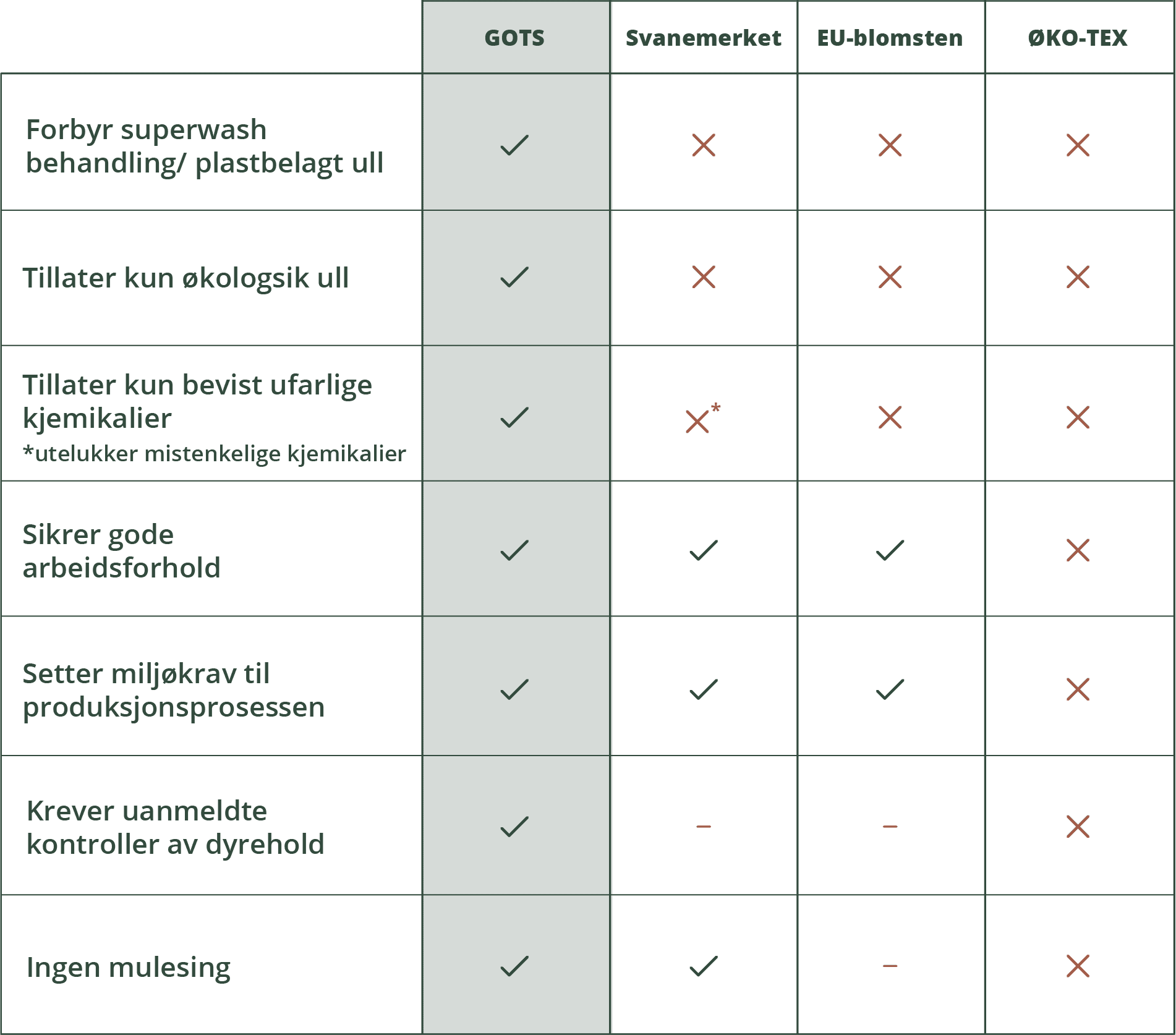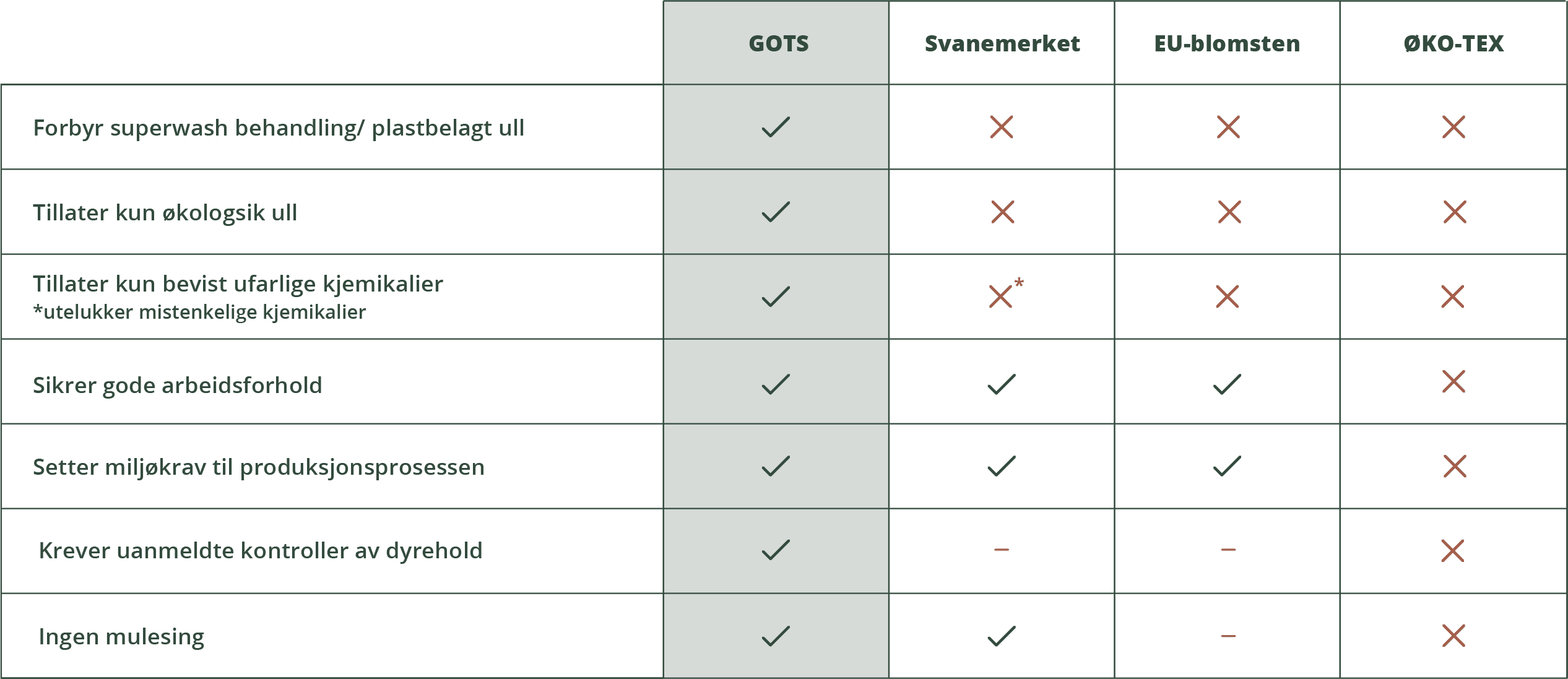 | Tillater kun økologisk ull | ✓ | ✗ | ✗ | ✗ |