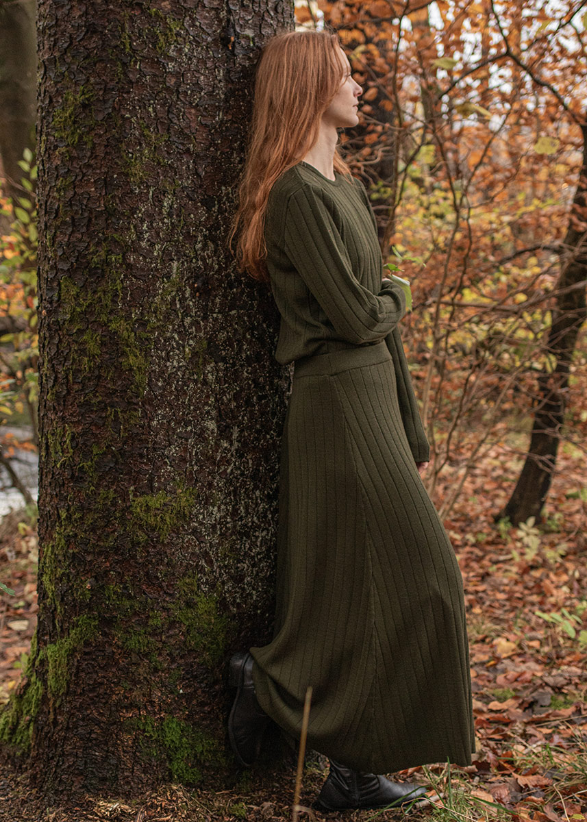 Et ankellangt ullskjørt med utsvinger silhuett. Skjørtet har elastikk i midjen og dekorative vertikale striper i strikket struktur. Skjørtet er strikket i mellomtykk og myk merinoull.